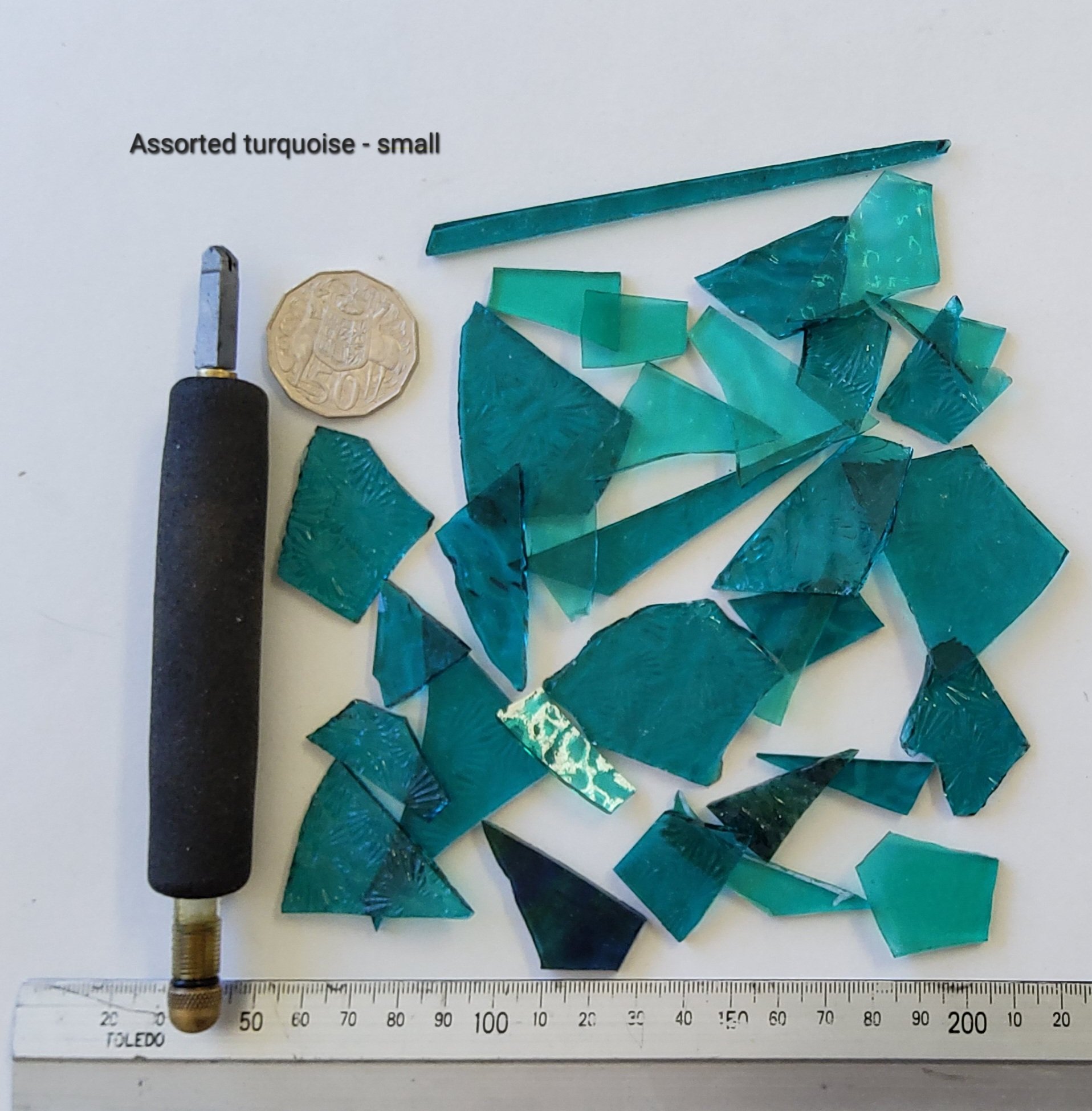 Assorted turquoise transparent glass in assorted sizes ready for you to use in your mosaic. Sold in 1kg lots.