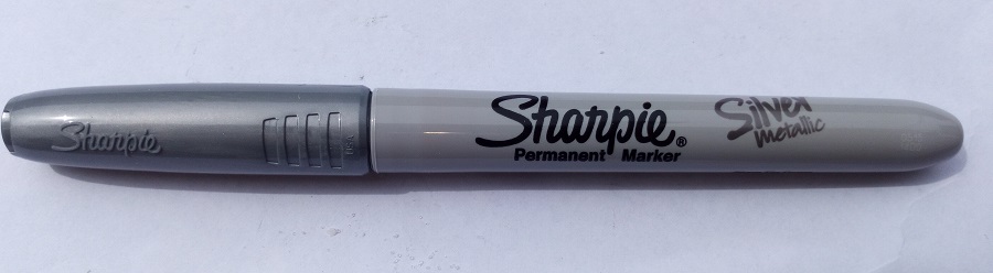 Silver Sharpie Pen. This pen gives a 1mm silver line. Use it to mark and draw on dark coloured glass.